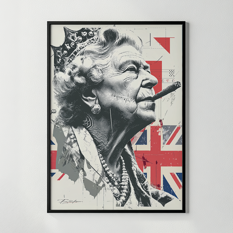 Queen Elizabeth II, reimagined as a symbol of unshakable authority and modern rebellion. Her gaze is firm, her presence monumental — a collision of royal legacy and street-born attitude. Tradition holds its ground, but the tone has changed.